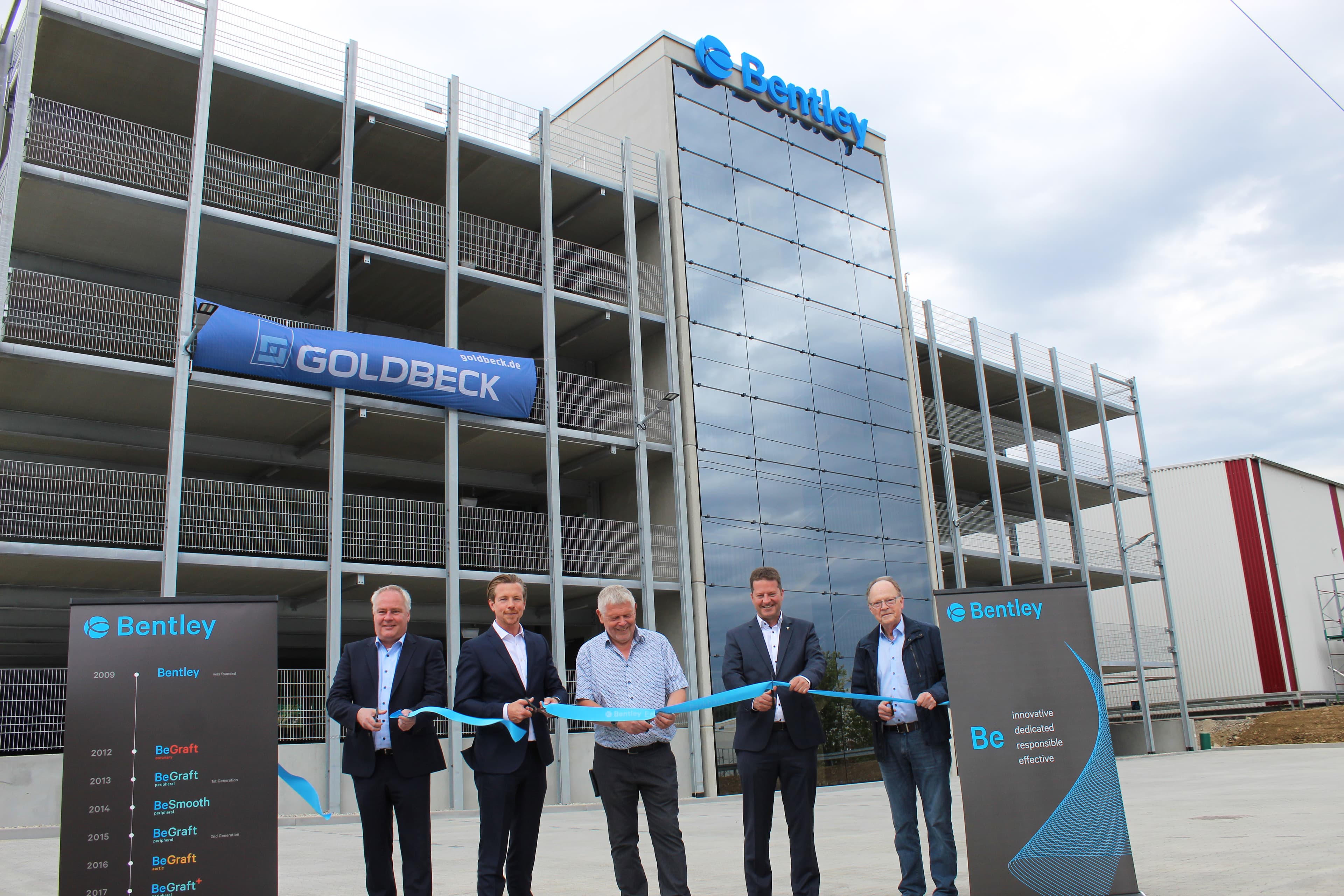 Bentley ist eine Firma mit ausgesprochenem Drive. 2009 gegründet, beschäftigt das Hechinger Medizintechnikunternehmen, das innovative Gefäßprothesen entwickelt und herstellt, inzwischen 250 Mitarbeiter. Den Firmensitz im Gewerbegebiet Lotzenäcker am Stadtrand von Hechingen erreichen die meisten Beschäftigten mit dem eigenen PKW. Für sie hat Bentley in nur siebenmonatiger Bauzeit ein 12 Meter hohes Mitarbeiterparkhaus errichten lassen, das am Dienstag, 31. Mai, offiziell freigegeben wurde. Auf zehn Etagen können die Mitarbeiter dort ganz exklusiv und kostenlos parken.